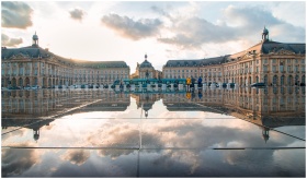 Breathtaking sunset reflection at Place de la Bourse, Bordeaux, France, showcasing historic architecture.