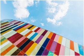 Colorful glass facade of a modern building with blue sky backdrop.