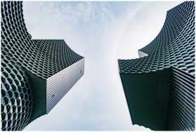 Modern skyscrapers with honeycomb facades showcasing architectural innovation in an urban setting.