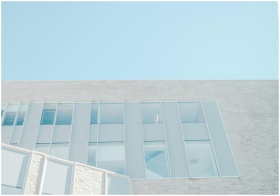 Low angle view of a modern glass facade against a