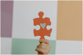 A hand holds a red puzzle piece with a heart, symbolizing connection and awareness.