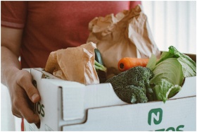 Person holding a box filled with fresh vegetables,