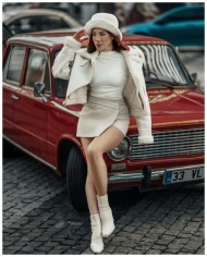 Stylish woman poses in white attire by a red vinta