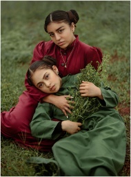 Two sisters in vibrant dresses share a tender moment on grass, symbolizing sisterly love.