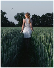Blonde woman in white dress walking in a peaceful wheat field at sunset in Germany.