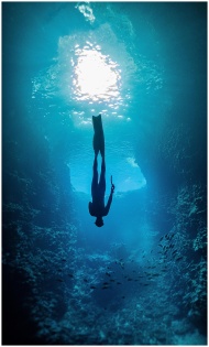 A silhouette of a freediver gliding through a vibr