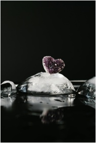 A heart-shaped amethyst crystal atop melting ice against a dark background.