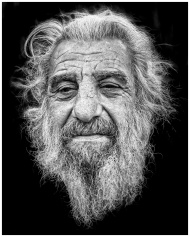 Black and white portrait of a senior man with a prominent beard and expressive features against a dark background.