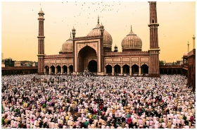 A large crowd gathers for prayer at the iconic Jama Masjid during Ramadan.