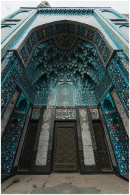 Low angle view of a detailed mosaic facade at a mosque entrance in Saint Petersburg.