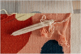From above of shuttle and needle placed on part of handmade carpet with circle pattern on loom frame during weaving process