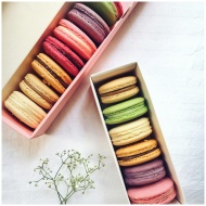 An assortment of vibrant macarons arranged in boxe