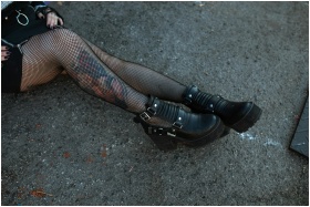 Close-up of a person's legs in fishnet stockings and black boots, showcasing edgy street style.