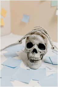 Skeleton skull with hands surrounded by sticky notes on a desk, creating a humorous scene.