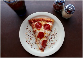 A mouthwatering slice of pepperoni pizza with cheese and spices, ideal for any meal.