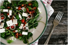 A vibrant and colorful spinach salad with feta cheese and tomatoes on a rustic table.