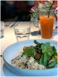 A delicious and healthy grilled chicken salad with fresh greens and an iced drink served at a restaurant.