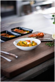 Close-up of a gourmet meal served on a wooden cutt