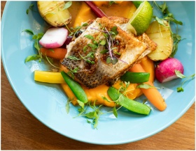 Colorful salmon dish with fresh vegetables on a bl