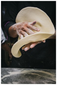 Close-up of chef tossing pizza dough in a kitchen,