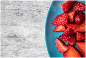 A close-up of fresh organic strawberries sliced on a blue plate for a healthy snack.