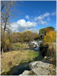 A peaceful waterfall amidst vibrant autumn foliage under a bright blue sky.