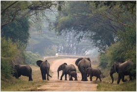 African elephants calmly crossing a dirt road surr