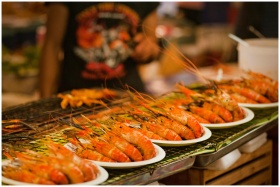 Deliciously grilled shrimps on plates ready to serve at a vibrant Bangkok street food market.