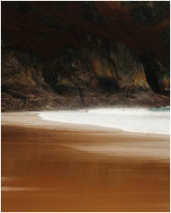 Tranquil scene at Jersey beach featuring waves and dramatic cliffs during sunset.