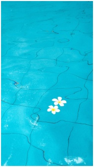 Serene image of a pool with white plumeria flowers floating on blue water. Perfect for summer themes.