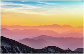 Colorful sunrise over misty mountains in Altmünster, Austria with a lone hiker silhouette.