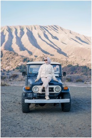 Adult woman in stylish outfit sits on a Jeep at Mount Bromo, showcasing travel adventure and style.