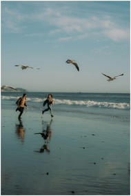A joyful couple runs along a sunny Los Angeles beach, surrounded by seagulls.