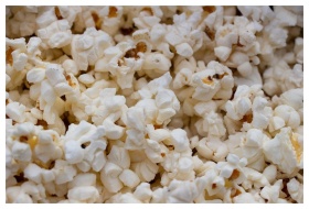 A nostalgic setup with popcorn, VHS tapes, and ret