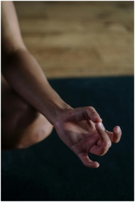 A close-up view of a hand in a yoga mudra position, symbolizing relaxation and focus.