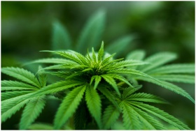 Vibrant close-up of a cannabis plant showcasing lush green leaves and natural growth outdoors.