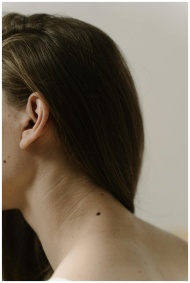 A detailed shot of a woman's neck focusing on a small mole. Minimalist and natural aesthetic.