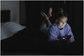 A woman lies in bed at night, using her smartphone