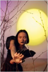 Artistic portrayal of a woman with a full moon backdrop and bold atmospheric setup.