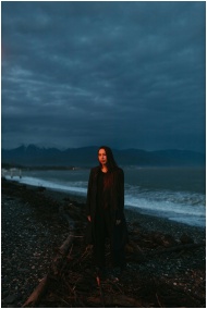 A mysterious woman stands on a rocky shoreline by the ocean at twilight, capturing a moody, coastal atmosphere.