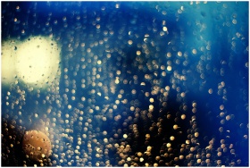 Abstract bokeh lights through a wet window create
