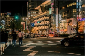 Illuminated cityscape in Osaka, Japan featuring modern architecture and bustling streets at night.