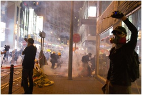Nighttime street protest scene with smoke and crowd activity in an urban setting.