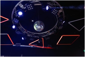 Dynamic nightclub scene with colorful lights and disco ball overhead.