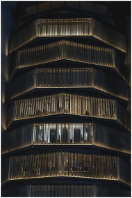 Modern abstract building facade with geometric shapes of floors and glass walls with people inside