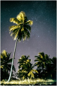 A vibrant starry night sky above swaying palm tree