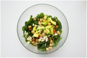 Fresh spinach salad featuring avocado and chickpeas, perfect for healthy eating.