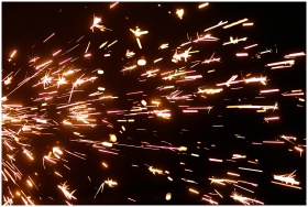 Close-up view of vibrant sparkler sparks illuminating a dark background.