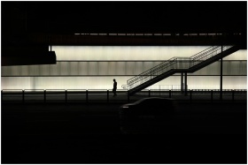 Nighttime scene in Seoul featuring a silhouette of a pedestrian against an illuminated wall.