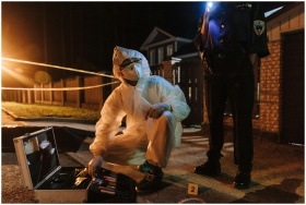 CSI team investigates a crime scene at night, using tools and flashlights for forensic analysis.